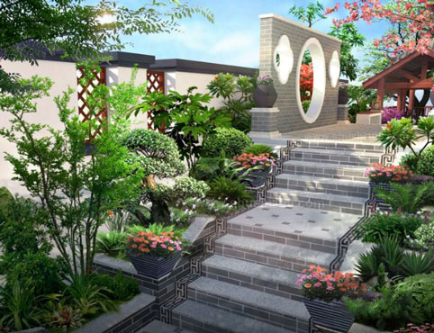 7、栽種植物:首先定位好庭院中樹的位置,主要樹栽植完后,庭園花園中的主景就有了定位,再一一向四周擴展,逐一在中其他中小景所需的植物,逐步構成園中花木配置。